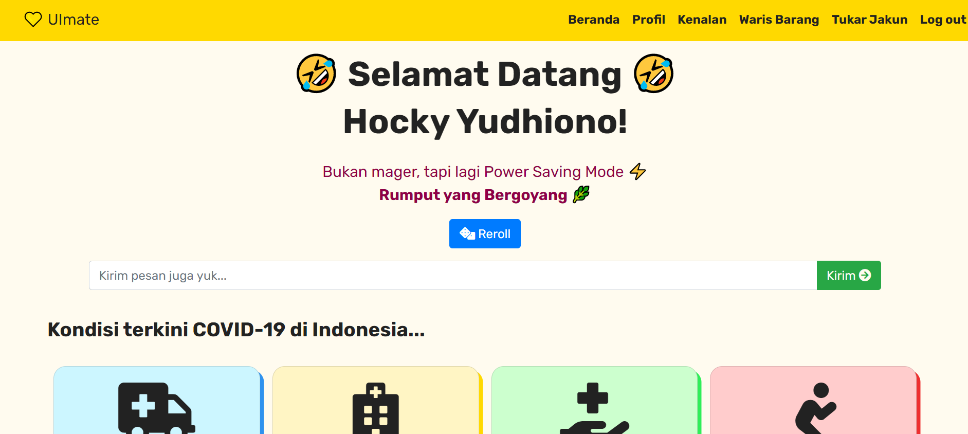 Jadi kami bikin semacam wadah buat meeting online, terus semacam discussion space, sama tempat buat maba tuker-tuker jakun yang ukurannya salah, sama buat mahasiswa yang udah mau lulus, bisa passing barang ke adik tingkatnya yang udah mau lulus. Website kelompokku bisa diakses di sini. Tugas kelompok 1 dan 2 nya sama, cuma seperti upgrade-annya aja ๐ .