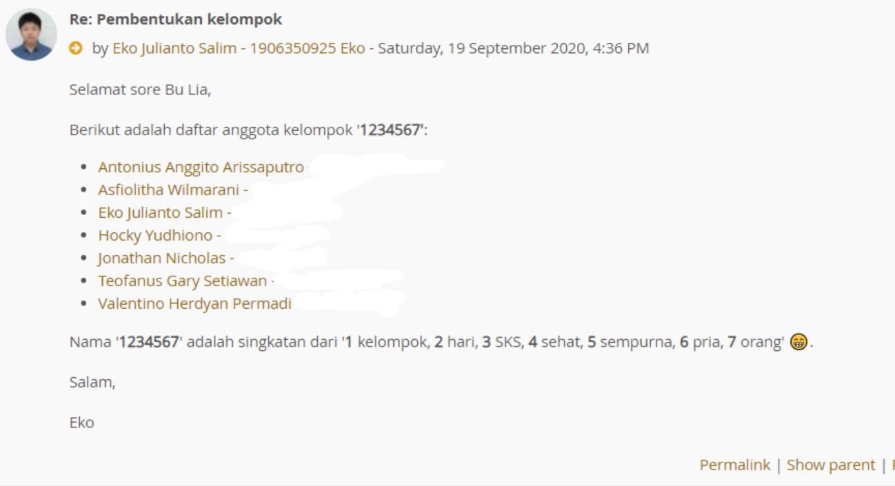 Kuliahnya tentu online juga setiap minggunya ada kuliah bareng semua kelas, ada yang hari senin dan selasa. Kuliahnya itu tiap hari ngumpul dulu di Meet/Zoom, terus dikelompokin 4-5 orang kemudian diskusi di forum. ๐งโ๐คโ๐ง